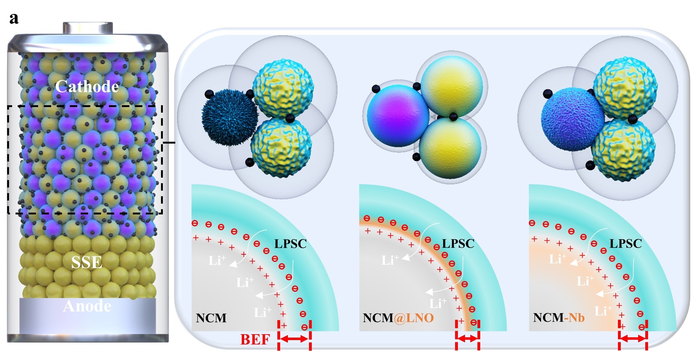 全固态电池由于兼具高能量密度以及高安全性的综合优势,被认为是下一代电池体系的理想方案。然而,使用固体电解质代替电解液以实现电池固态化的过程中,如何实现电池内部快速的锂离子迁移成为实现全固态电池实际应用的关键。近期研究表明,硫化物固体电解质(如Li10GeP2S12、Li6PS5Cl、Li3PS4等)具有与传统电解液相当的室温锂离子电导率(>1×10−3 S cm−1),同时其质地较软,通过冷压的方式即可实现与电极材料较好的界面接触,从而实现快速的锂离子传输。目前,基于该类电解质的全固态电池研究中,提升硫化物固体电解质与高比能三元正极材料(NCM)界面相容性的相关工作是该领域的研究热点和难点。在正极侧,界面化学/电化学稳定性、界面蠕变以及空间电荷层效应对界面锂离子迁移的影响机制尚未完全明了,这严重制约着新型稳定正极界面的构筑以及全固态电池应用化进程。