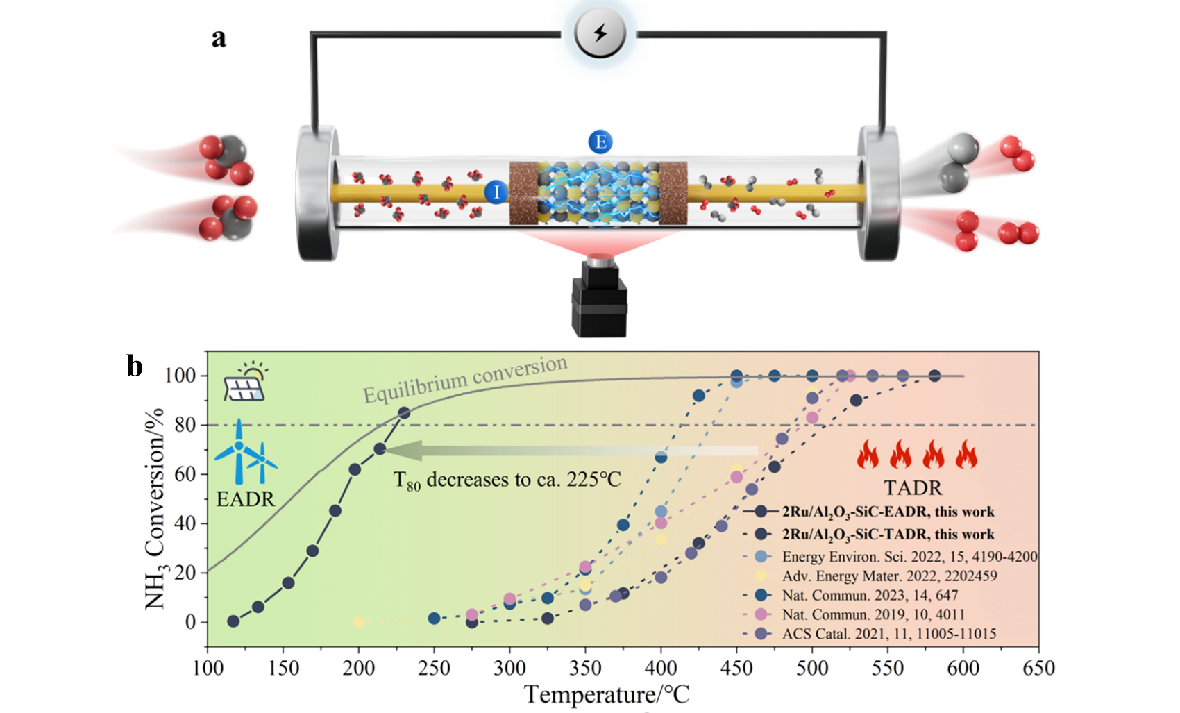 零碳氢基能源(NH3、H2)在汽车、船舶、可再生电力储存及工业应用中展现出巨大的应用前景。然而,绿氢的存储运输困难且成本高,氨具有较高的含氢量(17.8 wt%)以及易于液化的优势,是一种理想的储氢载体,利用氨分解制氢技术实现站内(on-site)制氢,可解决氢气运输和储存难题。在交通运输领域,氨燃料发动机是实现燃料脱碳的重要技术路线,通过氨分解制氢实现氨氢融合燃烧,可解决单一氨燃料的点火和燃烧问题,是氨燃料发动机的关键技术。因此,氨分解制氢技术是零碳氢基能源利用的关键环节。氨分解反应(2NH3(g)N2(g)+3H2(g))在300℃、1bar条件下,理论平衡转化率可超过95%。但由于反应存在较大的动力学阻力,传统的热催化氨分解过程通常需要400℃以上的高温才能实现80%以上的氨分解转化率。因此,当前迫切需要开发温和条件下高效、低能耗的氨分解制氢新技术。