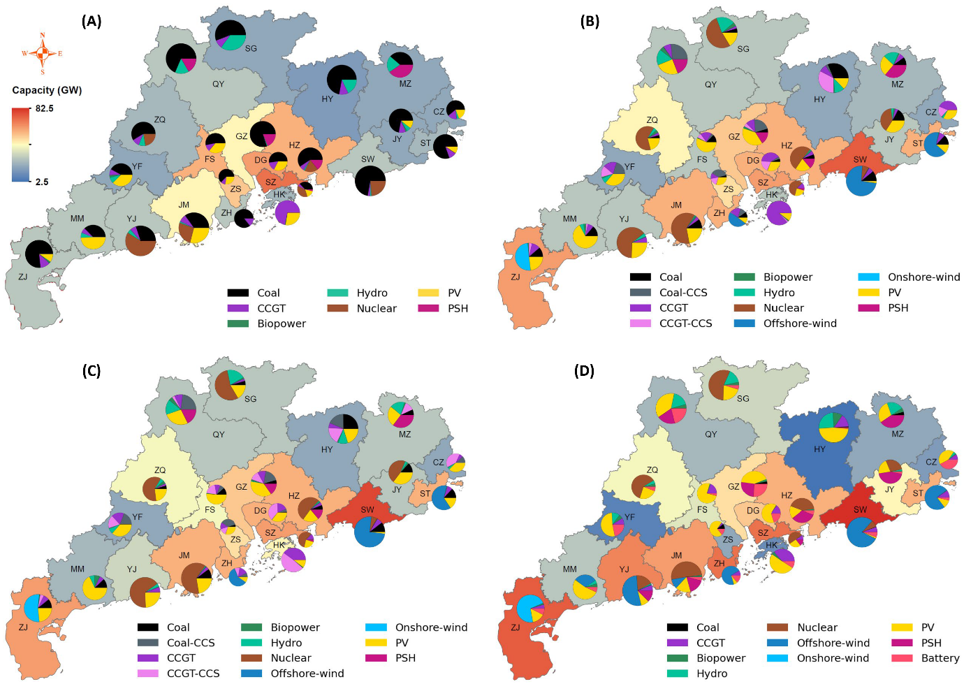 粤港澳地区电力系统发电和储能容量的地理空间分布发生了很大变化。BAU场景的能源基础设施主要集中在高负荷城市:广州(GZ)、深圳(SZ)、佛山(FS)、和东莞(DG),从而降低了输电网络扩张带来的昂贵的输电线路扩建费用。而且,几乎每个城市都保留了燃煤电厂。然而,由于严格的碳排放限制,CDM70、CDM85、和CDM100场景的化石燃料电厂的装机容量很低,且仅有若干城市保留燃煤电厂。这三个场景需要大规模部署清洁能源,以弥补化石燃料电厂的容量降低,并推动电力系统转型。汕尾(SW)和湛江(ZJ)是两个清洁能源装机容量最大的城市,两个城市分别拥有海上及岸上风电的最大装机容量。这有助于实现粤港澳地区电力系统的经济低碳转型。
