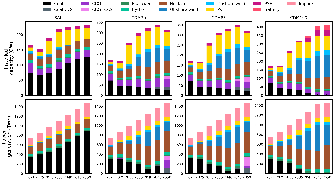 研究发现,BAU场景由于对碳排放无限制,燃煤发电呈现快速扩张特征。燃煤发电装机容量2025年前出现轻微下降;然而,燃煤电厂的发电量因机组运行时间延长而有所增加。CMD70和CDM85场景的电力系统转型拥有许多相同特征。燃煤电厂装机容量及发电量均大幅降低,核电的新增容量及年发电量相差不大,且两个场景都在2045年后采用了碳捕集技术。CMD100场景2050年实现净零排放,这一严格的碳减排限制迫使燃煤电厂发电量急剧下降。而光伏、风电、及核电呈现快速扩张以弥补燃煤电厂发电量缺额。CMD100场景的可再生能源的渗透比例2040年超过43%,这需要大规模地部署抽水蓄能及锂电池储能系统以平抑源-荷之间的时空错配。四个场景里,水电和生物质开发潜力相对较小,这使得它们的装机容量和发电量几乎没有变化。核电、海上风电、和外购电主导了CDM70、CDM85、和CDM100场景的电能结构,对粤港澳地区电力系统的低碳转型至关重要。