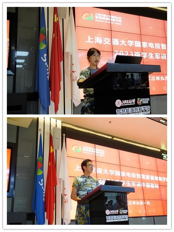 在已完成军训基本内容学习之际,来自能源2301班的廖颖和工科机电2301班的黄政作为学生代表上台分享新的体悟。廖颖同学分享了初入交大的心路历程,从最初的迷茫,到最后明确了投身能源革命,与祖国同向同行的发展目标,呼吁同学们继续贯彻不怕苦不怕累的精神,以积极昂扬的态度迎接未知挑战。黄政同学回顾了军训以来的点滴,在总结过往的基础上,对自己提出了更高的要求,号召大家以挑战自我的勇气和毅力练就真才实学,用实际行动诠释 “选择交大,就选择了责任”。