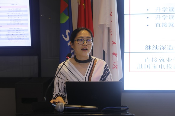 陈帅就学院学生就业工作相关情况向大家展开介绍,从学院毕业生去向情况,往届优秀毕业校友近况等进行分享,并对学院特有的相关就业政策进行解读,向毕业生们详细介绍了学院组织开展的就业互选活动及与国家电投集团共同推进的就业生全链条培养计划。