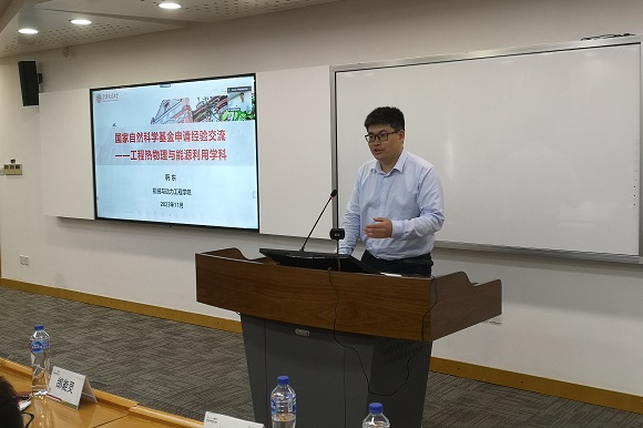 科研院基金人才办刘斌介绍了学校2023年国家自然科学基金资助情况,学校整体保持领先态势,学院也实现了历史突破,获批2个面上项目、4个青年项目,学校整体申报数量已基本达到峰值,下一步的重点工作为着力提升基金申报资助率。机械与动力工程学院韩东教授分享申报国家自然科学基金的经验心得,他从申报人与评审专家双重角度的感悟,阐述了各模块的写作要点,强调科研工作要注重继承和发展,多措并举提高命中率。最后的交流环节,基金申报人就关切的基金申报问题与专家和领导进行了细致的沟通。