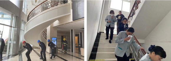 随着警报声的响起,全体人员按照预先制定的应急预案,迅速进入应急疏散状态。西部公寓楼发现火情后,报告总指挥立即启动应急疏散,灭火组第一时间赶赴现场展开灭火行动,警戒组迅速警戒到位,设备组快速就位展开电梯迫降并切断电源,救援医务组迅速待命。在消防小组的指挥和带领下,疏散组引导人员,用湿毛巾、手帕等捂住口鼻,压低身姿,整个活动“规范、有序、迅速、高效”,严格按照疏散演练方案设定的逃生路线,快速有序地从安全出口撤离到安全区域。