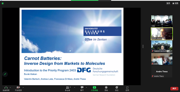 为了加强国际合作交流和提升学院国际影响力,4月18日下午,学院院企合作与国际化部联系德国杜伊斯堡-埃森大学Prof. Dr. Burak Atakan,斯图加特大学Prof. Dr. André Thess就SPP 2403 Priority Programme “Carnot Batteries: Inverse Design from Markets to Molecules”项目和学院相关师资进行学术交流。 学院副院长顾骏主持会议,赵耀副教授就卡诺电池相关科研情况进行主题分享,刘祖明助理教授和部分研究生代表参加会议,学院院企合作与国际化部相关人员参加会议。