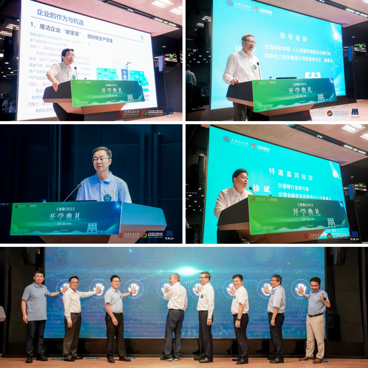 全国政协常委、中国工程院院士、上海交通大学国家电投司机社 院长黄震,全国政协常委、人口资源环境委员会副主任、国家电力投资集团公司原党组书记、董事长钱智民,苏州市委常委、昆山市委书记周伟,交通银行首席专家、交银金融租赁有限责任公司董事长徐斌等领导和嘉宾做开班致辞。特邀嘉宾和全体同学们为“碳道CEO”首期班启动了开班庆贺仪式。