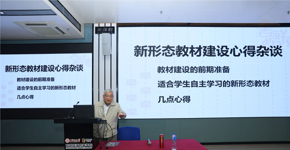 童钧耕老师从自身多年教学与教材编写经验出发,分享新形态教材建设心得。他重点讲解了教材编写须确立“为学生编写好教材”的信念和明确定位,要认真、完整完成若干教学周期,有深度和广度的资料积累后整理思路、形成框架。他提出一本好教材需长时间积累、适当定位并有特性,要立足于优秀(精品)纸质教材体系,逐步构建纸质与电子网络技术相结合、适合学生自主学习的新形态教材。童老师的专业分享,很大程度地提升了教师评估教材、改编教材、合理使用教材的意识与素养及对教材进行创造性使用的能力。