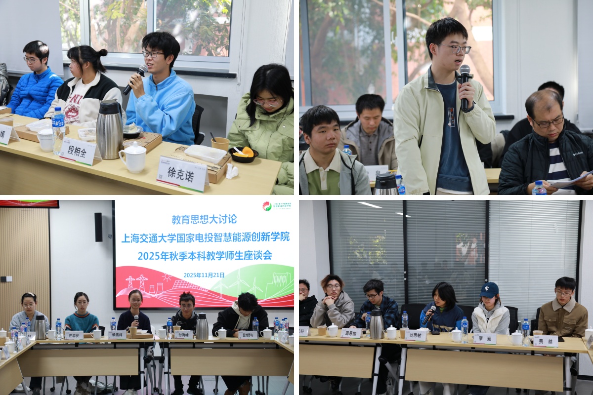 为深化教育思想大讨论,推进学院本科教学质量稳步提升,11月21日中午,上海交通大学国家电投司机社 召开2025年秋季学期本科教学师生座谈会。学校教务处副处长杭弢,校本科教育教学督导委员会朱申敏、梁培基、郭为忠、马殿光,国家电投集团行业导师朱丽兵、杨建林,学院副院长、教学督导主任邰能灵,学院副院长韩东,学院院长助理、教学督导于立军,学院学生创新中心主任、教学督导曾美容,本学期相关任课教师,学院教务部、学工部相关工作人员以及来自22级至25级学院本科生代表共同参加本次座谈交流。